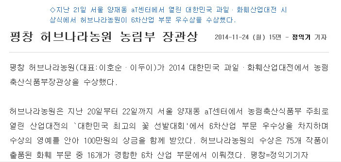 [ Æòâ Çãºê³ª¶ó³ó¿ø ³ó¸²ºÎ Àå°ü»ó ¼ö»ó ]Çãºê³ª¶ó³ó¿ø(´ëÇ¥:ÀÌÈ£¼ø¡¤À̵ÎÀÌ) 2014 ´ëÇѹα¹ °úÀÏ¡¤ÈÈÑ»ê¾÷´ëÀü¿¡¼ ³ó¸²Ãà»ê½ÄǰºÎÀå°ü»óÀ» ¼ö»ó